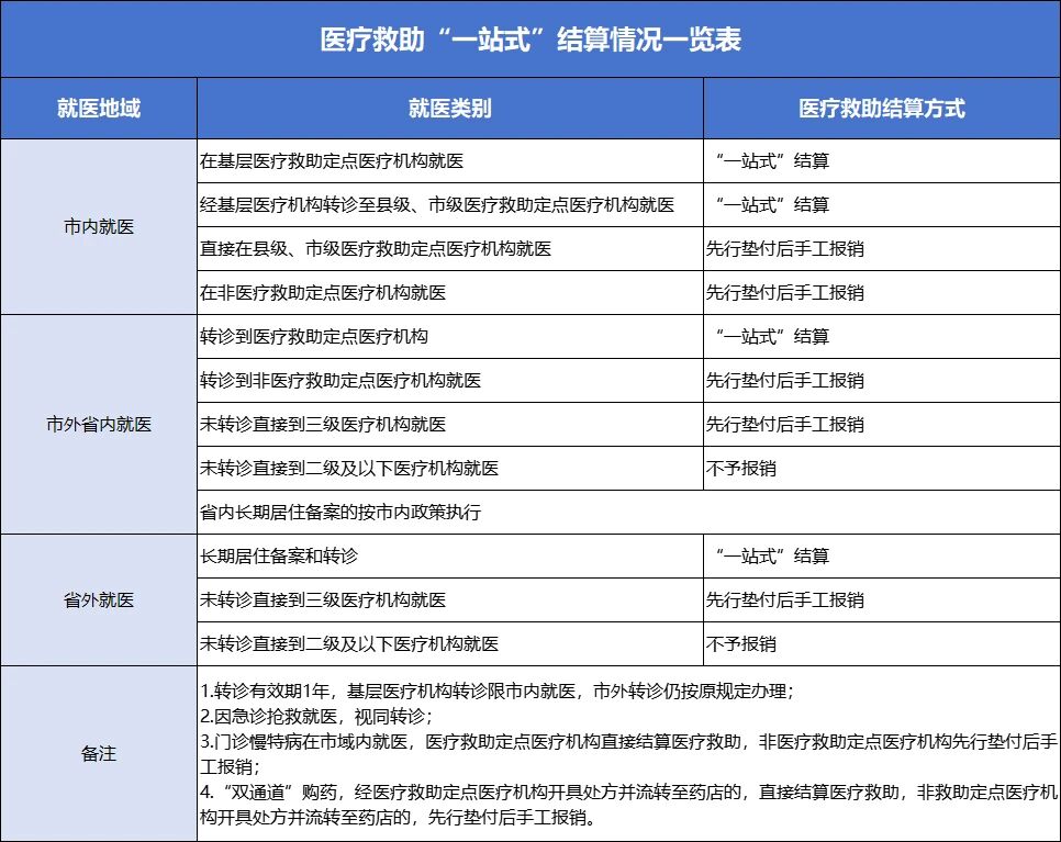 2026年1月1日起,在医保定点基础上实行医疗救助单独定点管理。在基层医疗救助定点医疗机构就诊和经基层首诊、转诊到市域内医疗救助定点医疗机构就诊的,可享受基本医保、大病保险和医疗救助在医疗机构“一站式”结算,医疗救助对象仅需支付个人自付费用;不能“一站式”结算的医疗救助费用,需患者先行垫付而后到医疗救助身份认定地医保经办机构按规定办理手工报销(见后附医疗救助“一站式”结算情况一览表)。