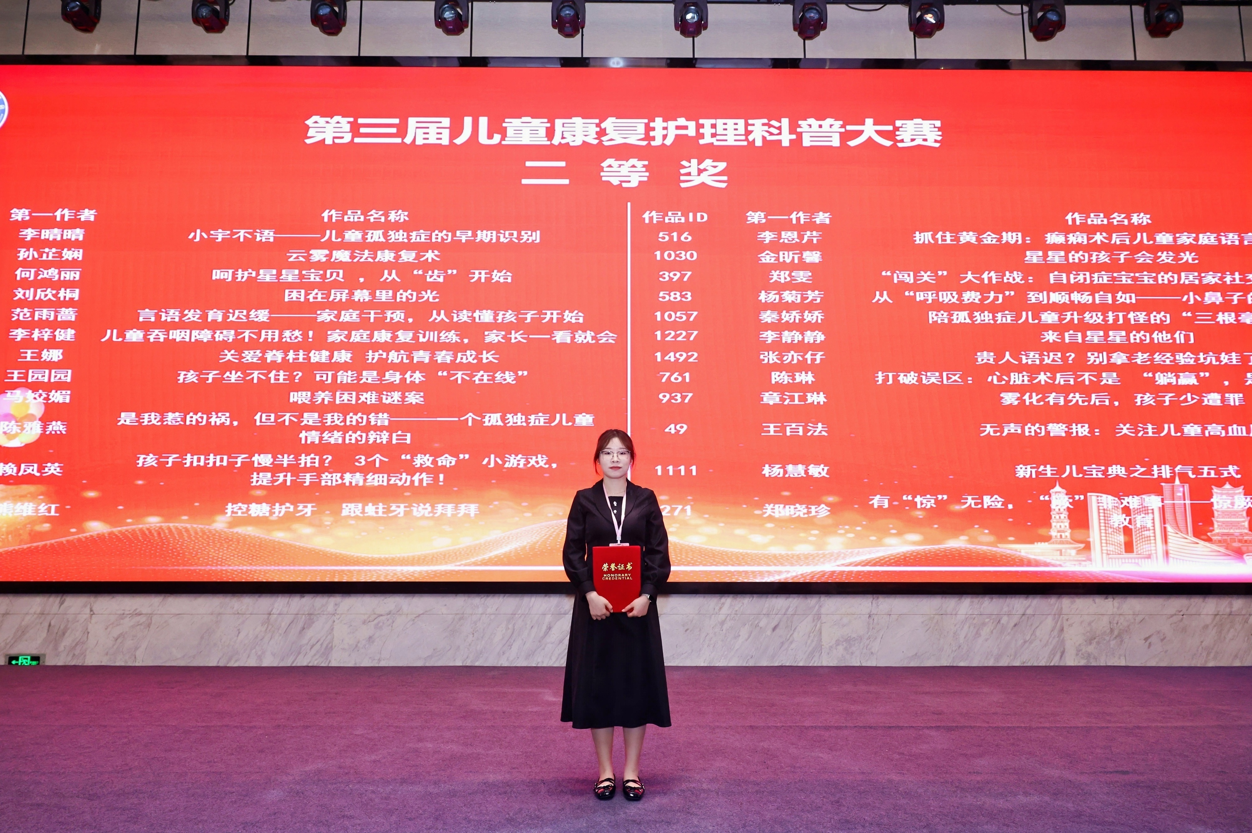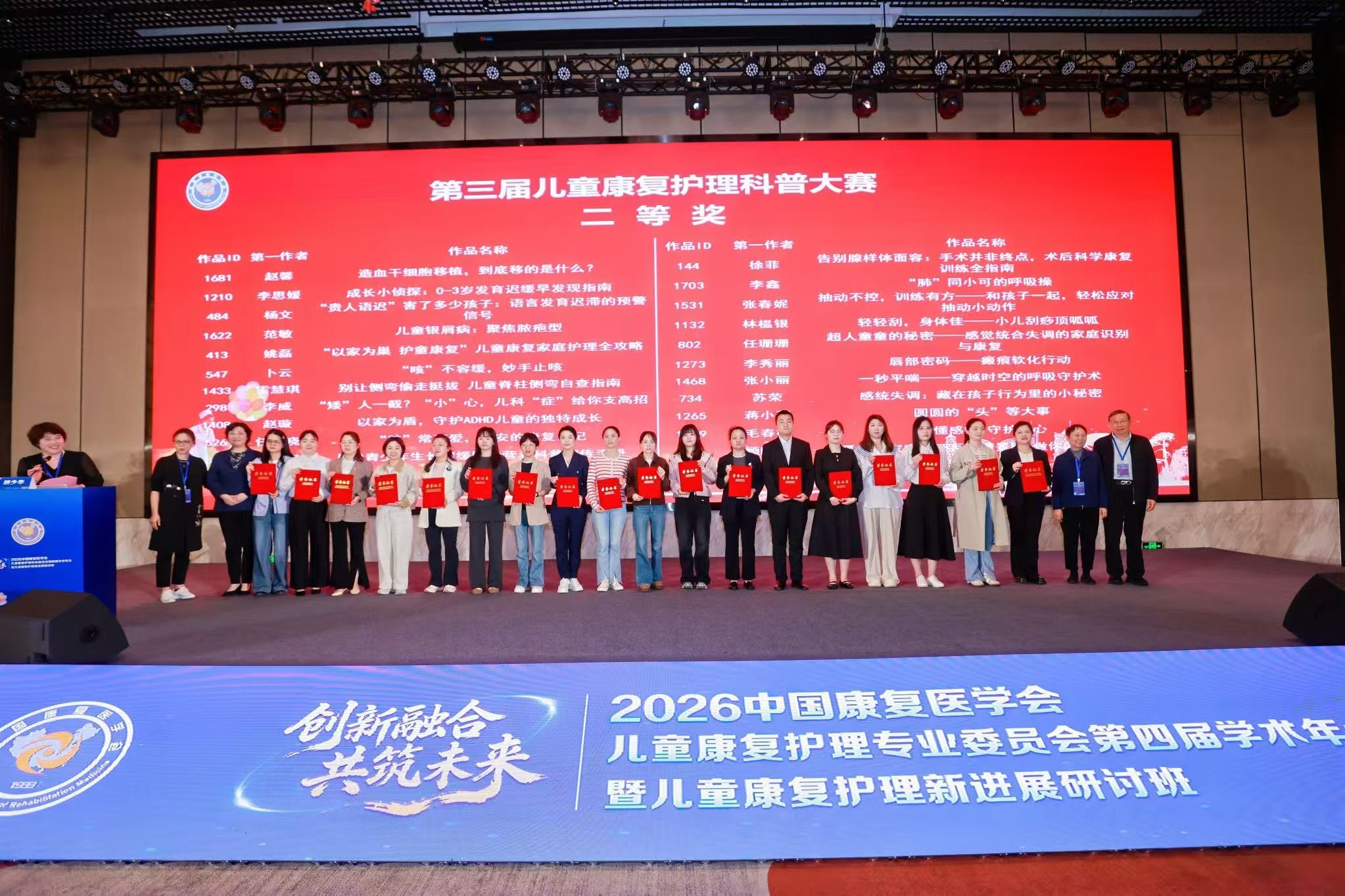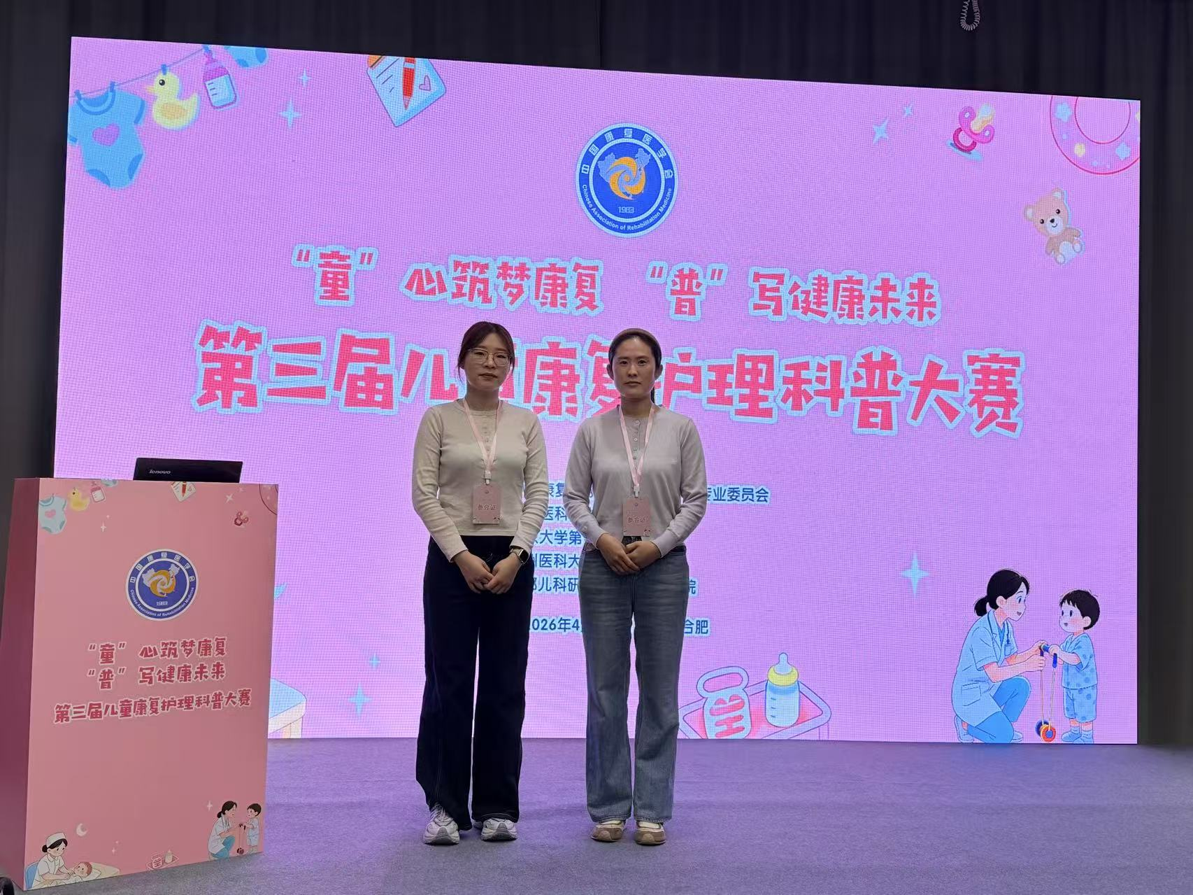 2026年4月16日,从中国康复医学会第三届儿童康复护理科普大赛现场传来喜讯——我院儿童康复科李静静、范雨蔷老师创作的科普作品《来自星星的他们》、《言语发育迟缓--家庭干预,从读懂孩子开始》,在全国903份参赛作品中脱颖而出,荣获二等奖!
