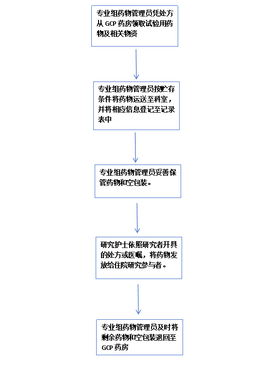 医生下医嘱后,专业组药物管理员凭处方从GCP药房领取试验用药物试验用相关物资。专业组药物管理员按贮存条件将药物运送至科室,记录运送工具、到科时间/温度,登记至《临床试验药物运送过程温度记录表》。专业组药物管理员应妥善保管包装盒及剩余药物,并将包装盒及剩余药物及时归还给GCP药房。研究护士发放试验用药物时,将研究参与者基本信息包括物资名称、物资编码、研究参与者鉴认代码、发放日期、发放数量等内容登记至《临床试验用药物发放记录表》,并签名。